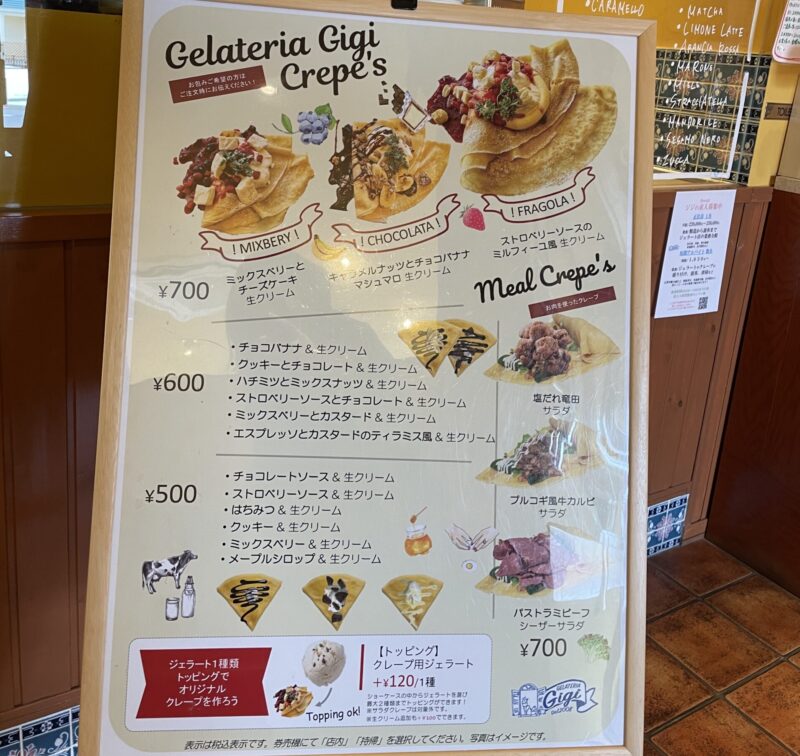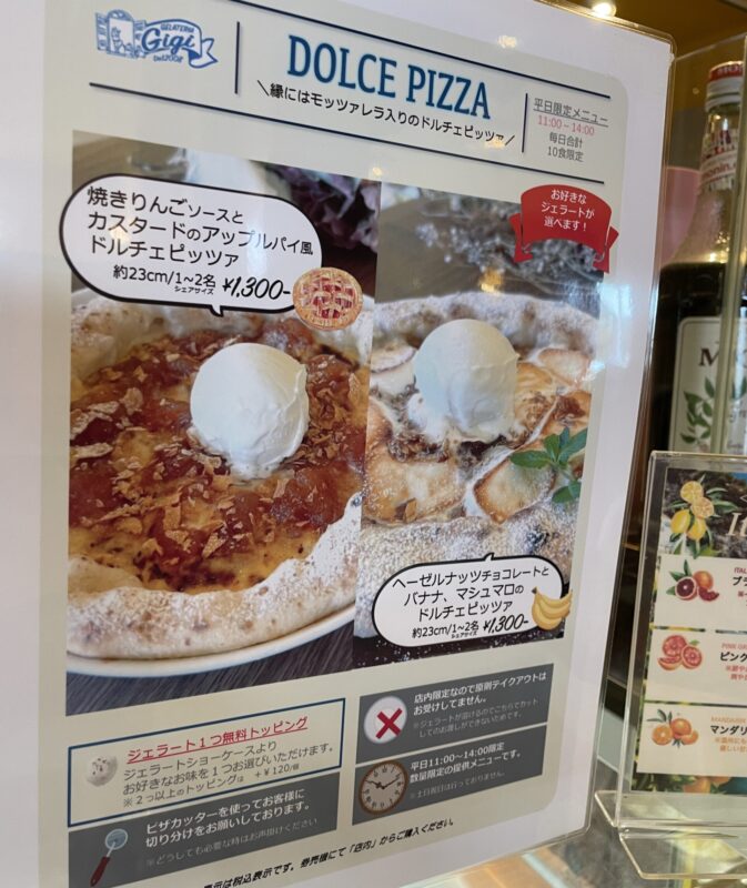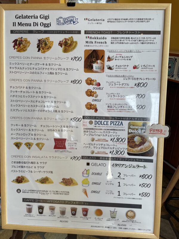 ジジには、ジェラート以外にもクレープやドルチェピザなど、豊富なスイーツメニューが魅力的。